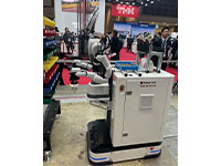 今回のTHKブースで新たに提案されたのが、ヒト型ロボット「NEXTAGE」の可動範囲の大幅拡大だ。AMRと組み合わされ、移動を可能とし、新たに昇降軸を設けたことで、上下(低い⇆高い)にも対応。デモの方にも注目が集まった。